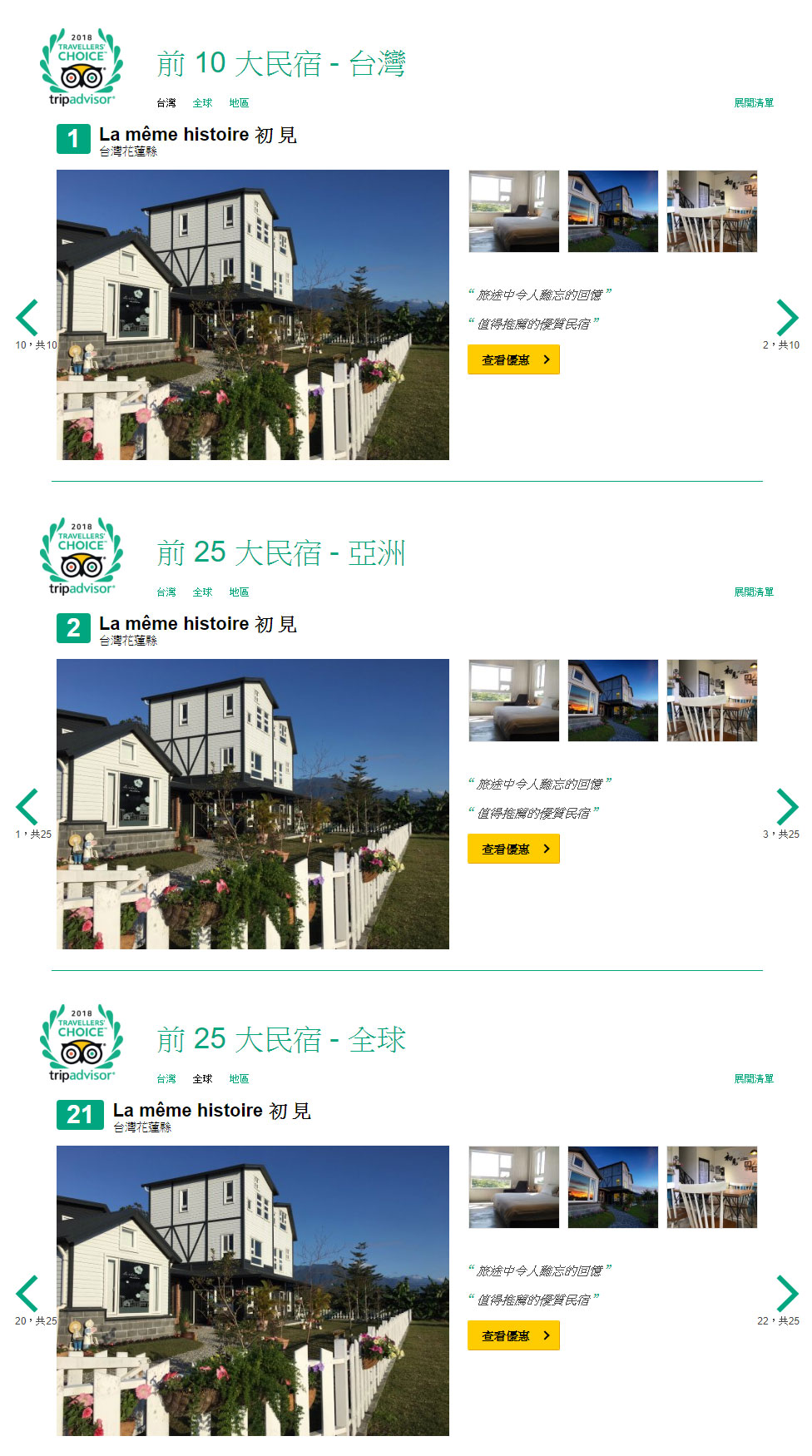 榮獲「台灣/第一」、「亞洲/第二」、「全球/第二十一」之 花蓮民宿